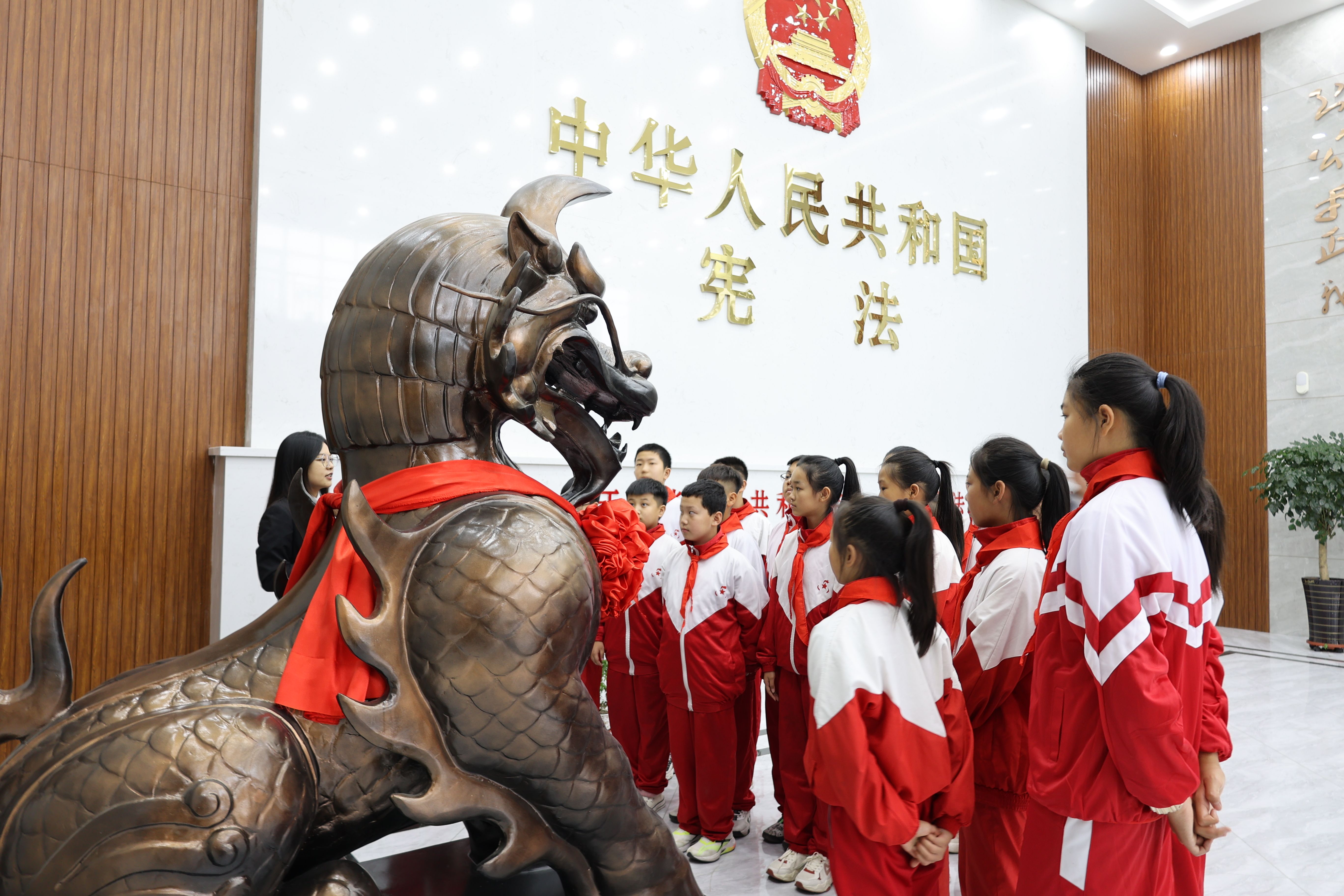 为进一步加强青少年儿童的法治意识,提升未成年人的自我保护能力,富区法院开展“法治第一课”开放日活动,邀请学生们走进法院,模拟庭审现场,采取互动提问的方式,深入讲解了未成年人日常生活中的法律知识,在学生们的心田中播撒法治种子。同学们通过聆听讲解员讲述中国古代神话“獬豸”的故事,学习法徽、法槌、法袍所代表的意义及使用规范,进一步增强了法律意识。
