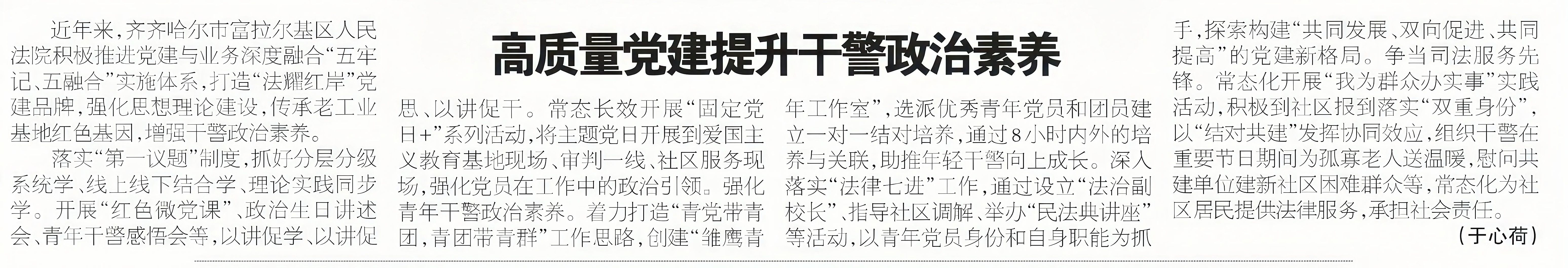 齐齐哈尔市富拉尔基区人民法院积极推进党建与业务深度融合“五牢记、五融合”实施体系,打造“法耀红岸”党建品牌,强化思想理论建设,传承老工业基地红色基因,增强干警政治素养。