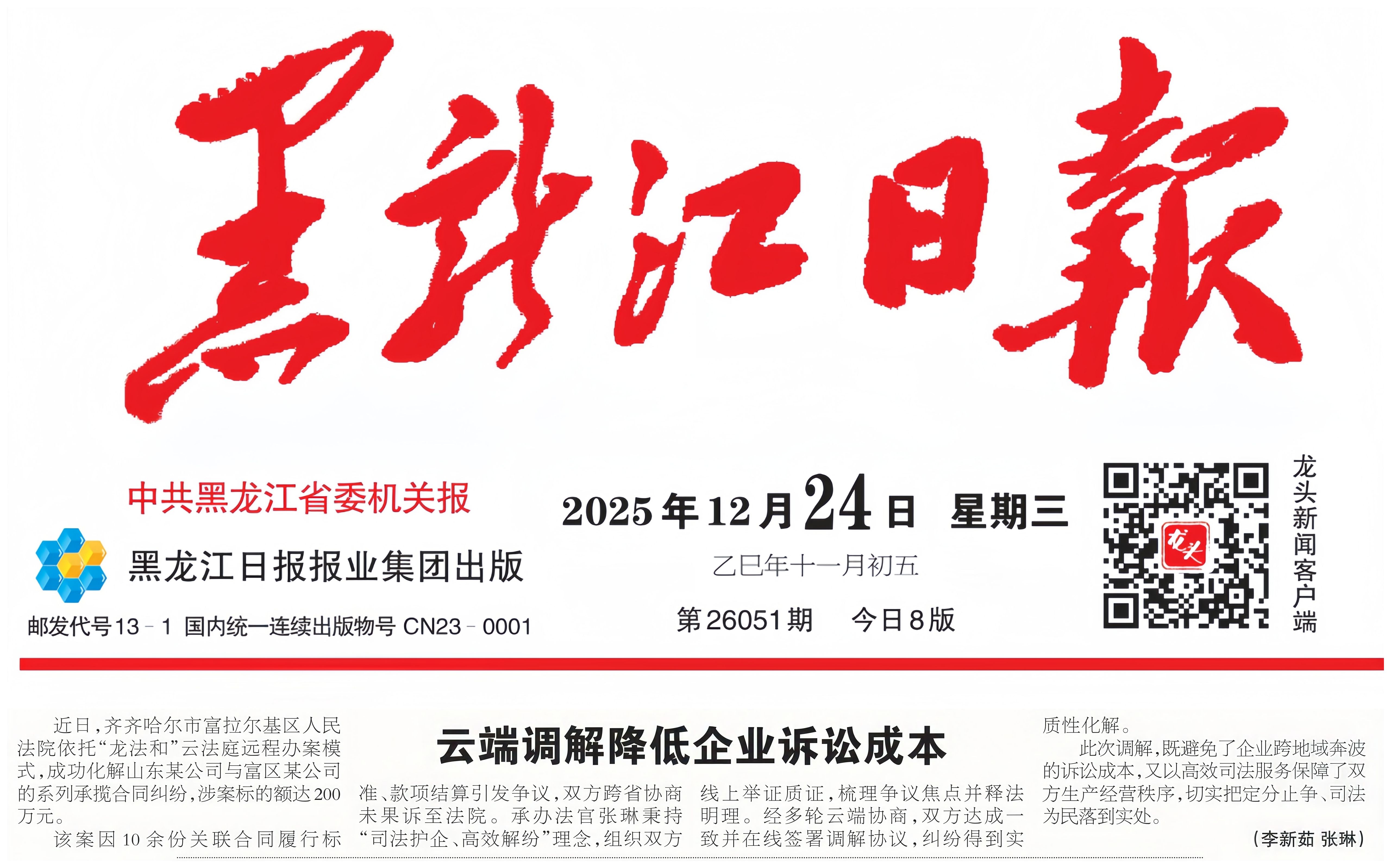【媒体聚焦】《黑龙江日报》刊发:云端调解降低企业诉讼成本