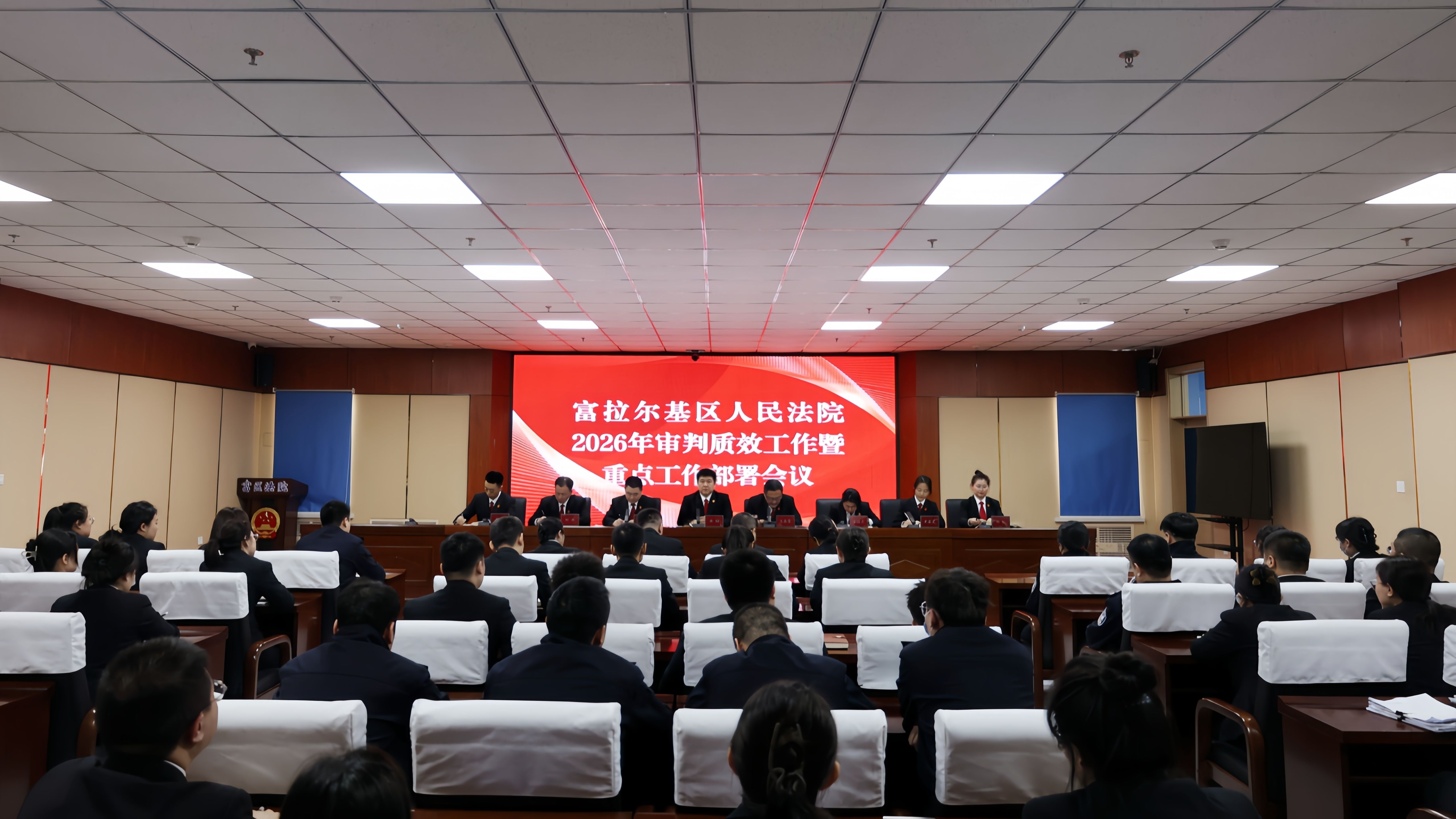 3月17日,富拉尔基区人民法院召开2026年审判质效工作暨重点工作部署会议,传达学习全国两会及政法系统工作会议精神,全面分析当前形势任务,部署2026年重点工作任务。党组书记、院长赫楠出席会议并讲话,党组副书记、副院长王春雷主持会议,院领导及全体干警参加会议。