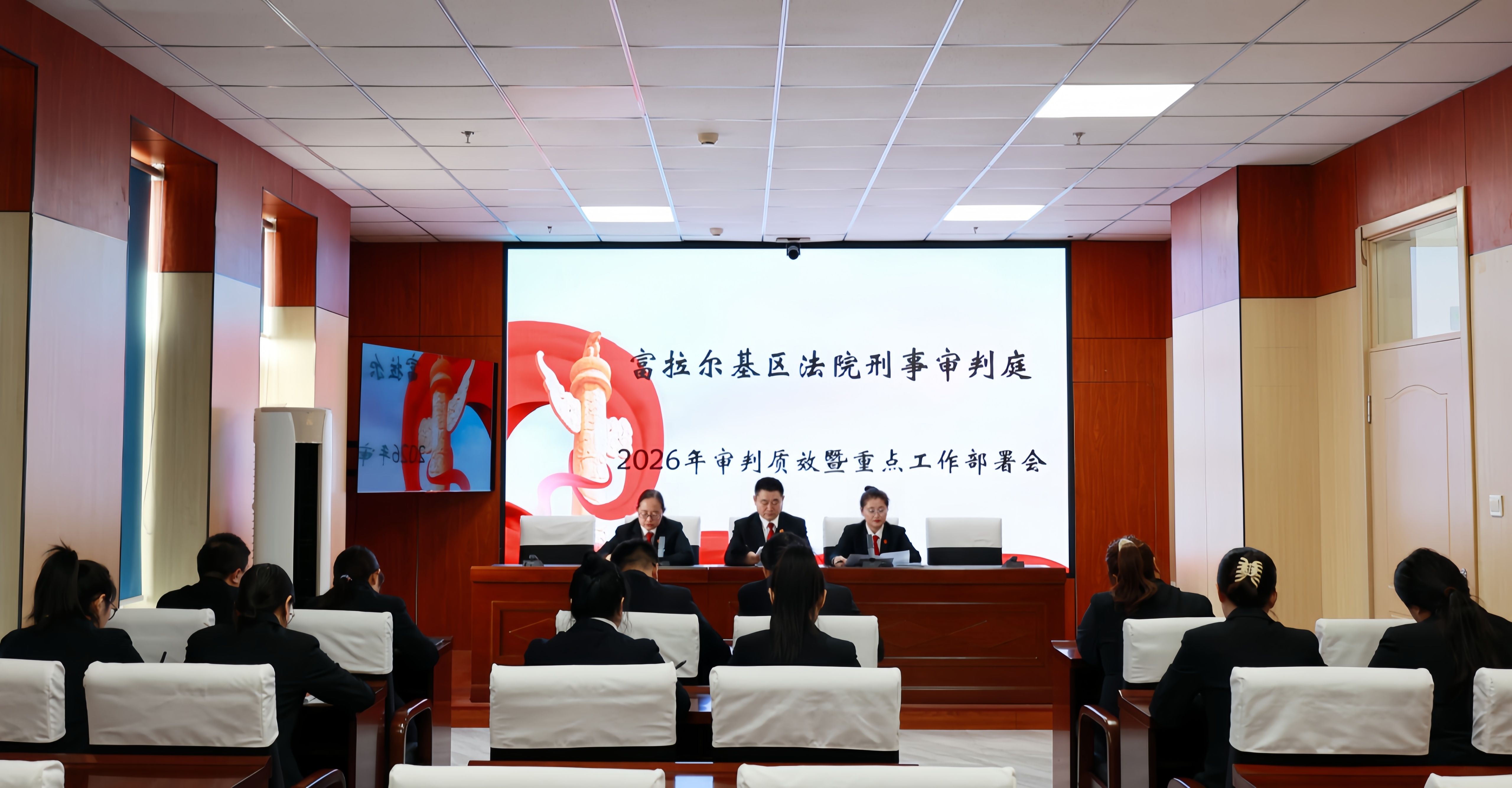 为深入贯彻落实全院工作会议精神,全面谋划2026年刑事审判工作,压紧压实办案责任,提升审判质效与队伍建设水平,3月20日,富区法院刑事审判庭召开2026年工作部署会。党组成员、副院长于跃忠,审判委员会专职委员邱红出席会议并讲话。刑事审判庭庭长杨力主持会议,全体刑事审判庭干警参加会议。